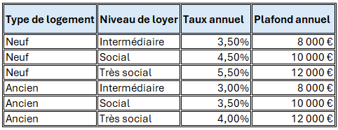 L’amortissement est calculé sur 80 % du prix d’acquisition net de frais, auquel s’ajoute, le cas échéant, le montant des travaux pour les logements anciens ayant fait l’objet d’une réhabilitation lourde. Le cumul annuel des amortissements est limité à 8 000 € par foyer, et peut être majoré de 2 000 € ou 4 000 € selon la part des revenus provenant de locations en secteur social ou très social.